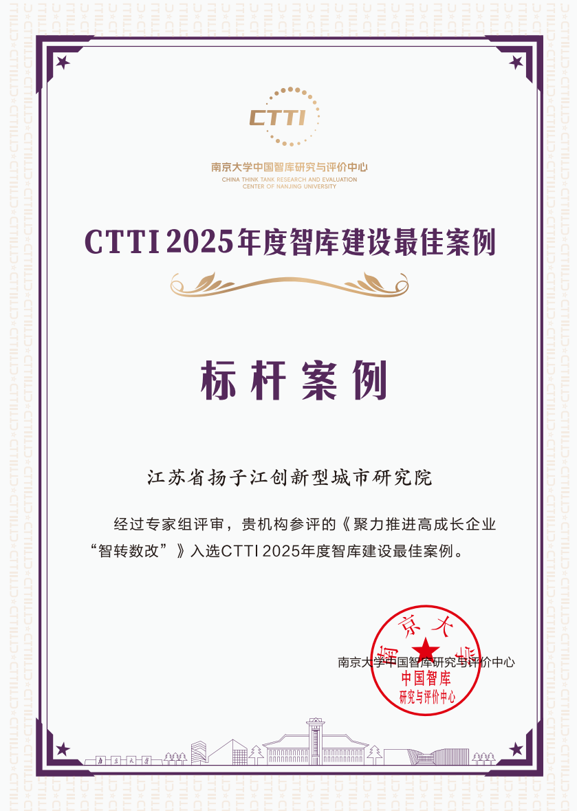 2025年11月21日,南京大学主办的“2025新型智库治理论坛”成功举办,会上公布了年度智库成果获奖情况,由南京市社科院、江苏省扬子江创新型城市研究院报送的《聚力推进高成长企业“智改数转”》《聚焦“四个着力点” 聚力发展走在前——“南京经济社会发展十人谈”系列活动》分别获得年度智库建设最佳案例的标杆案例、示范案例;《足球为“媒” 城“势”如虹——关于推动江苏城市足球联赛发展的对策建议》《中国创新型城市建设与南京实践》等4项成果分别获得特等奖1项、一等奖2项、二等奖1项,市社科院成为国内唯一获标杆案例和唯一获优秀成果特等奖的城市智库(不含直辖市)。