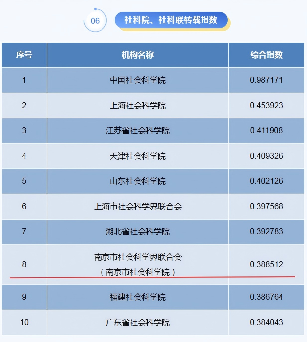 2025年4月19日,中国人民大学“复印报刊资料转载指数研究报告”发布,南京市社科联(院)在2024年度社科院、社科联学术成果转载指数排名中位列全国第八、城市社科院(联)第一(不含直辖市)。