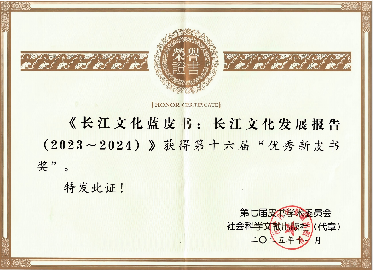 2025年11月28日,“第二十六次全国皮书年会暨首届中国式现代化研究智库论坛”在北京召开,会议颁发了第十六届优秀皮书奖。由长江文化促进会、南京长江文化研究院联合编撰的《长江文化蓝皮书:长江文化发展报告(2023—2024)》获“优秀新皮书奖”。