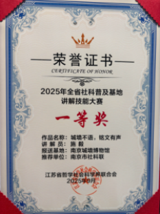 2025年9月,经市社科联推荐、指导,南京城墙博物馆施毅获评“担负起新时代的文化使命”第四届各省区市社科普及基地讲解员大赛三等奖、2025年全省社科普及基地讲解技能大赛一等奖,南京中国科举博物馆汪俊涛和雨花台烈士纪念馆曹丹妮获评2025年全省社科普及基地讲解技能大赛二等奖,三人均位列省赛前十名。