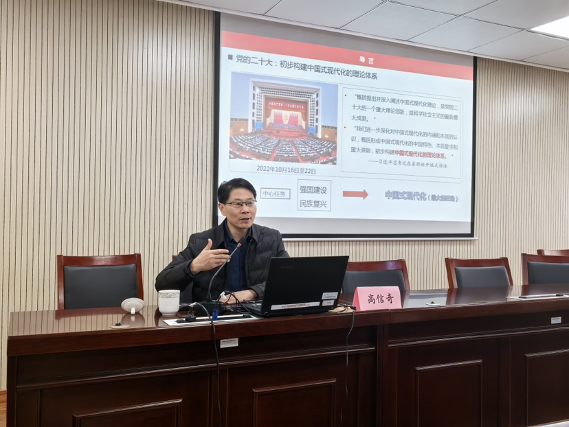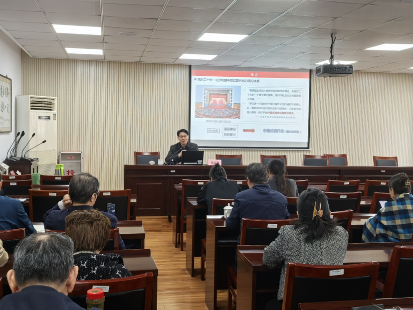 中共南京市委党校教授、博士高信奇,以《推动中国式现代化开辟广阔前景》为题,从中国式现代化的特征特色和要求、推进中国式现代化的战略部署以及推进中国式现代化的步骤方法等三个方面,用大量的案例数据,对学习贯彻党的二十届三中全会精神做了深入浅出的专题辅导,为社团在推进中国式现代化中如何推动自身发展、服务好经济社会发展及充分发挥好社会组织作用提供智力支撑。