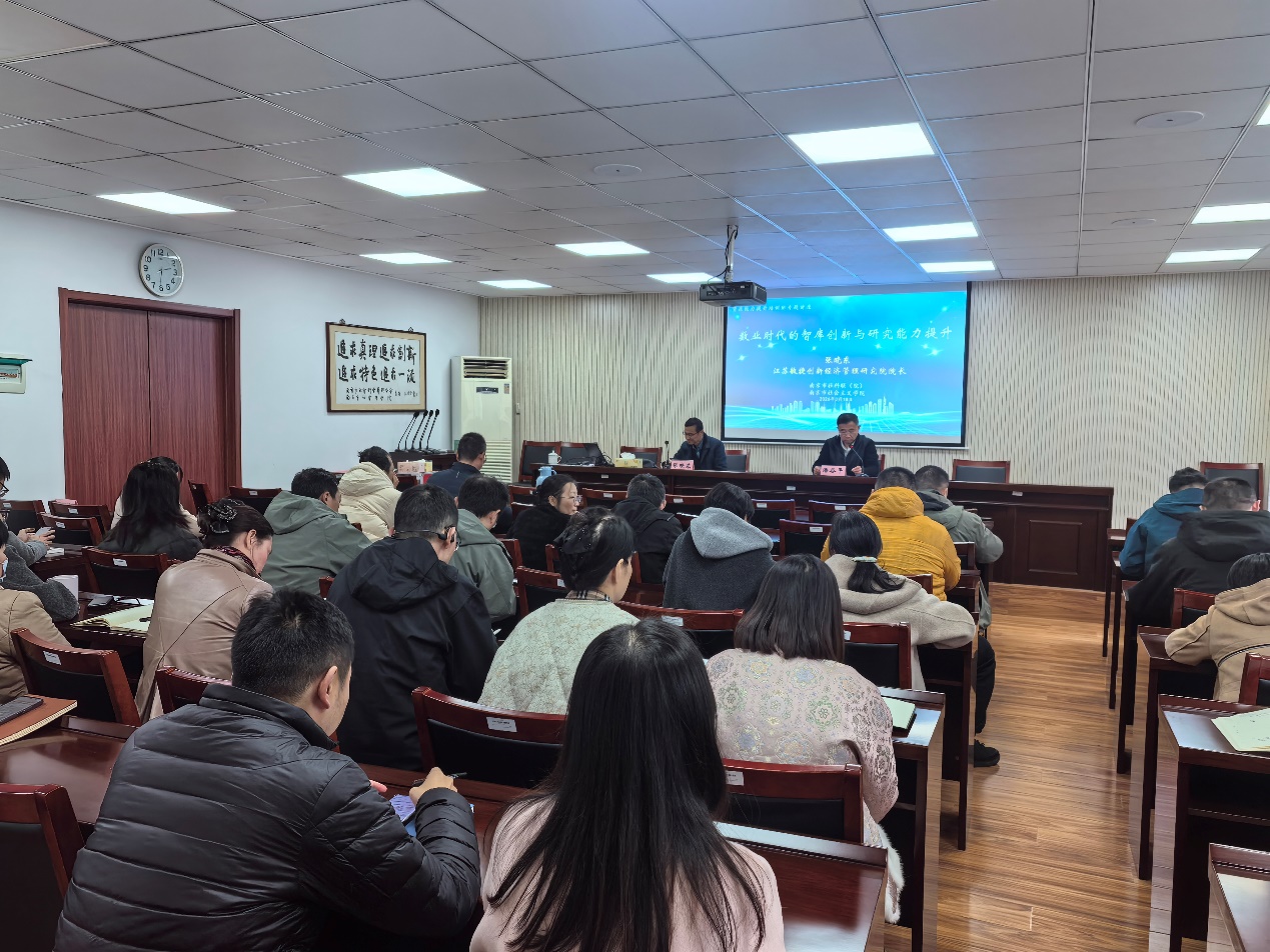 3月18日,南京市社科联(院)举办本年度首期资政能力提升培训班。本次培训特邀江苏敏捷创新经济管理研究院院长、中国管理科学学会学术委员会执行主任张晓东研究员作题为《数业重塑智库 咨政与研究能力提升的思考》的专题辅导报告。市社科联副主席、市社科院院长潘谷平主持培训并作总结讲话。市社科院全体科研人员、市社科联相关处室负责人和青年干部,市社会主义学院、市委党史办、区社科联的部分同志参加了此次培训。