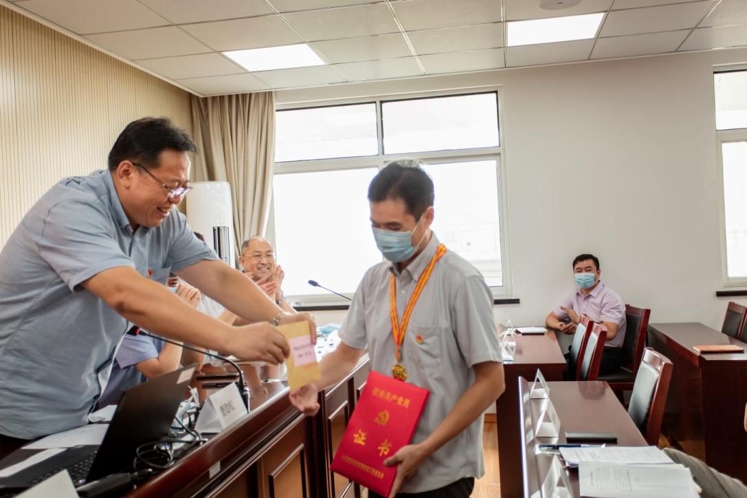 选举大会后,举行了简洁而隆重的颁奖仪式,曹劲松同志为获得2021年市级机关优秀共产党员鞠平同志颁发了证书、奖牌和奖金。