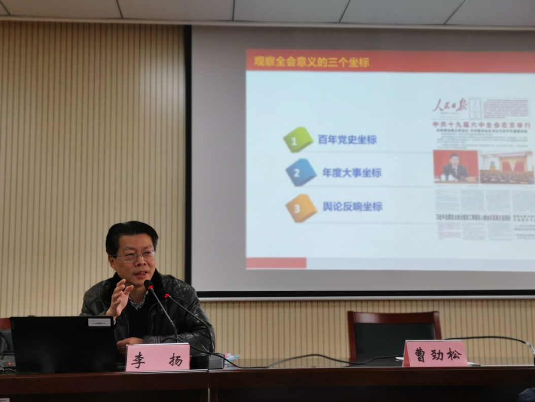 李扬院长授课内容丰富、理念清晰、重点突出。他从“观察全会意义的三个坐标”“全会的要素”和“全会的要论”展开,集中阐释了四个“深刻把握”,即深刻把握党的新的历史决议的重大意义、深刻把握党百年奋斗的初心使命和重大成就、深刻把握“两个确立”的决定性意义和深刻把握“十个坚持”历史经验的底蕴意涵,最后以“浩渺行无极,扬帆但信风”点题,表示站在新的历史起点上,党的十九届六中全会必将进一步凝聚起百年大党的智慧与力量,在过去一百年赢得了伟大胜利和荣光的中国共产党和中国人民,也必将在新时代新征程上赢得更加伟大的胜利和荣光。