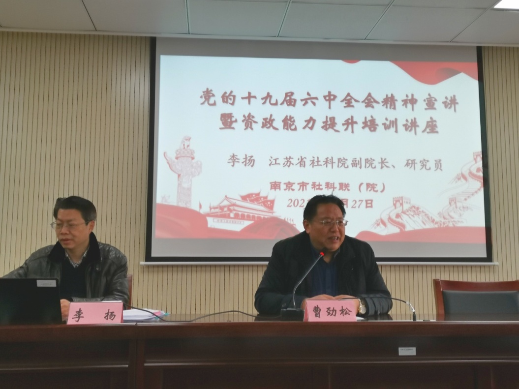 12月27日上午,南京市社科联(院)邀请江苏省社科院副院长李扬研究员为联(院)全体同志进行党的十九届六中全会精神宣讲,主题是《在新时代新征程上赢得更加伟大的胜利和荣光》,本次讲座也是2021年度联(院)最后一期“资政能力提升培训”讲座。