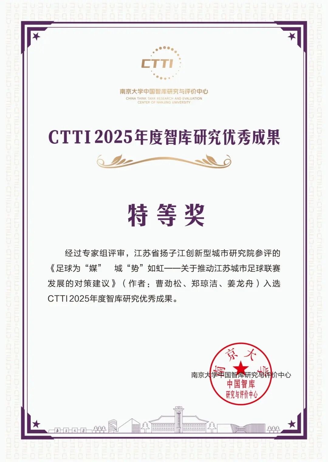 创城院首席专家曹劲松研究员等的成果《足球为“媒” 城“势”如虹——关于推动江苏城市足球联赛发展的对策建议》获评“CTTI 2025年度智库研究优秀成果——特等奖”
