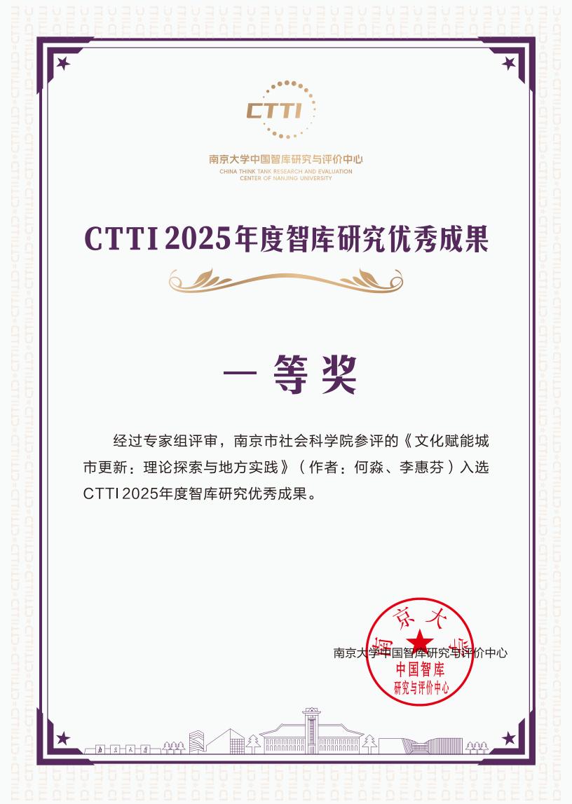 市社科院何淼副研究员、李惠芬研究员的成果《文化赋能城市更新:理论探索与地方实践》获评“CTTI 2025年度智库研究优秀成果——一等奖”