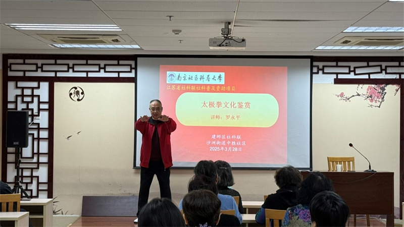 为积极响应国家关于推广全民健身的号召,深化基层社区文化服务,3月28日,南京市社科联联合建邺区中胜社区新时代文明实践站举办了“南京社区科普大学”精品课堂活动。活动特邀陈式太极拳第12代传人、南京城市文化研究会太极拳文化分会会长罗永平老师,为社区居民带来一堂生动的《太极拳文化鉴赏》课程,吸引了许多居民参与。