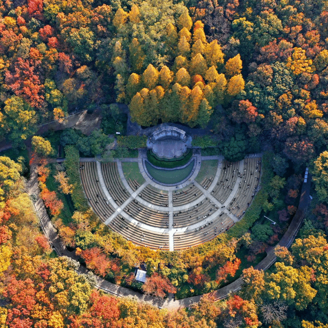 最开始拍摄中山陵高空风景的时候,因为租不起飞机,只能租吊车,“吊车吊一个篮子把你挂在里面,拎到30米左右高的位置去拍。”吊车开不进去的地方,屠国啸也试过爬树等各种方法。很多人熟知的音乐台照片就是他在树上完成的。