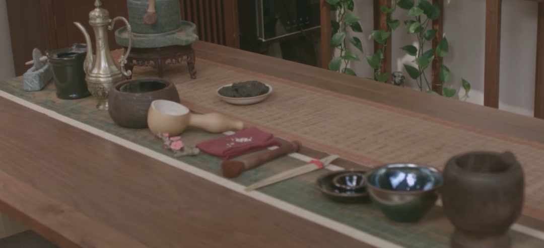 完整的点茶程序中,有标志性的用具,如臼碎饼茶的茶臼、不损茶色的石质茶磨、罗面细密的茶罗、击拂茶汤的茶筅。