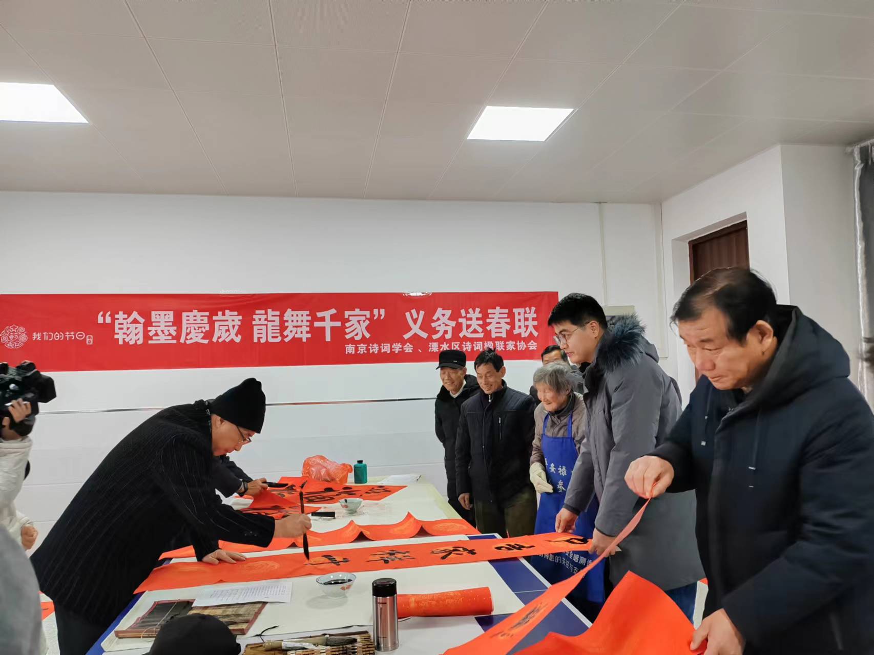 一副副对联、一个个“福”字、一声声祝福……2月3日上午,南京诗词学会走进溧水区石湫街道九塘村,为村民们送上龙年新春祝福,受到当地群众的热烈欢迎。南京诗词学会会长刘任、常务副会长徐安庆,溧水区委宣传部常务副部长吴永胜、区文联主席盛木杉、区诗词楹联家协会主席杨金保,南京市钟山书画院院长吴忠文等参加了当天活动。